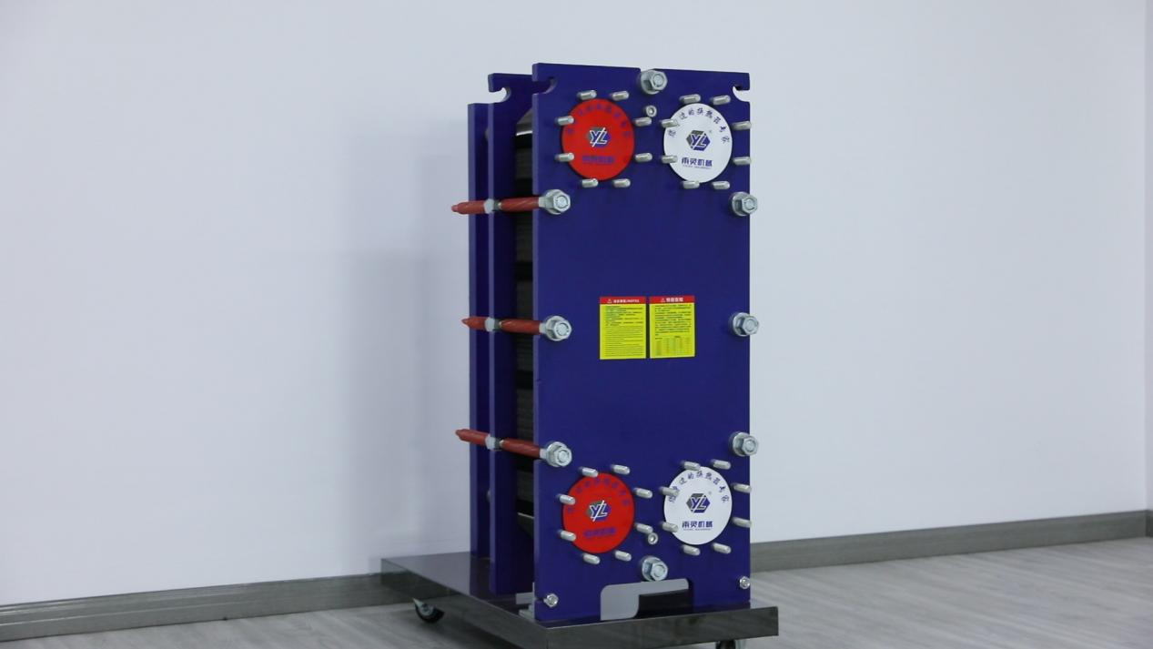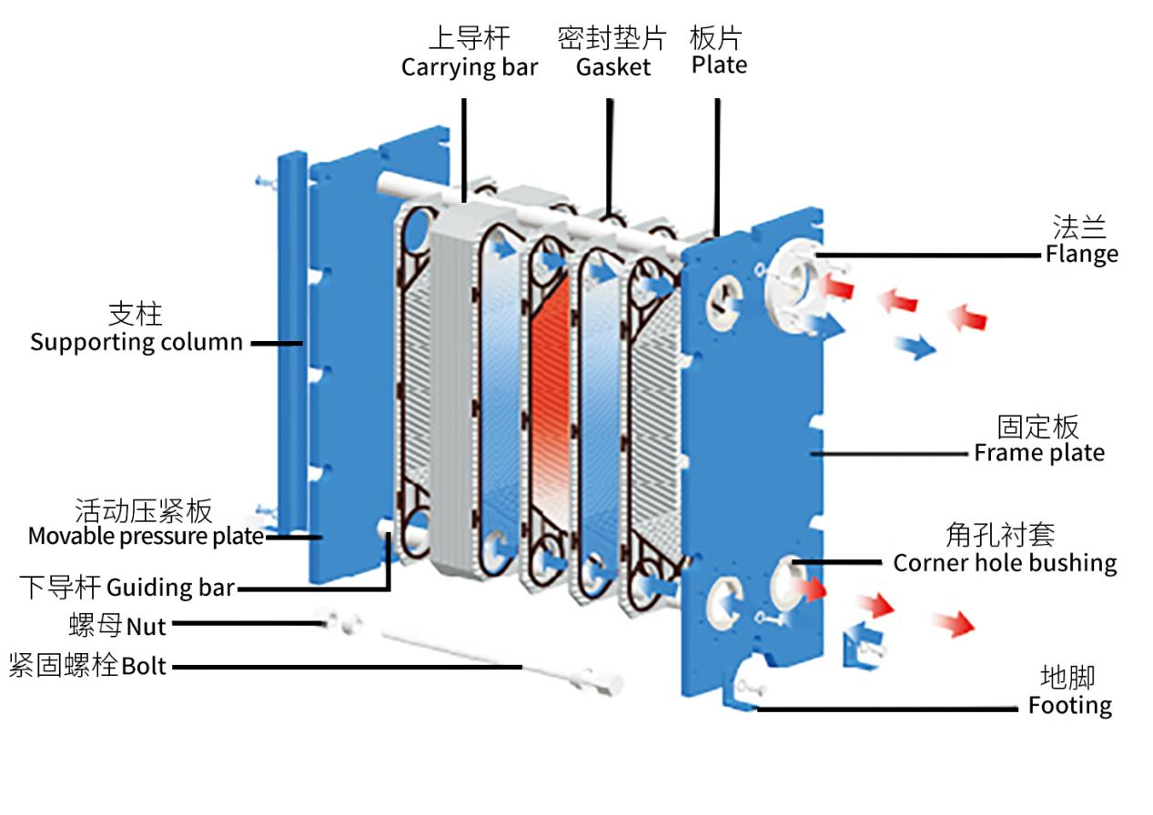 The plate heat exchanger is assembled by stacking the plates between the fixed and movable pressure plates, and then clamping them together with clamping bolts.